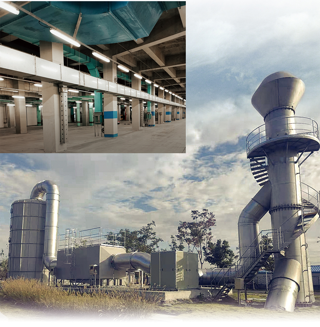 上海 · 泰和全地下式污水处理厂 污水处理规模 40万 m3/d (含污水处理厂和污水调蓄池两大块) 地下室内空间离子送风净化系统 250000 m3/h 除臭处理规模 540000 m3/h 无动力吸附装置 64800 m3/h