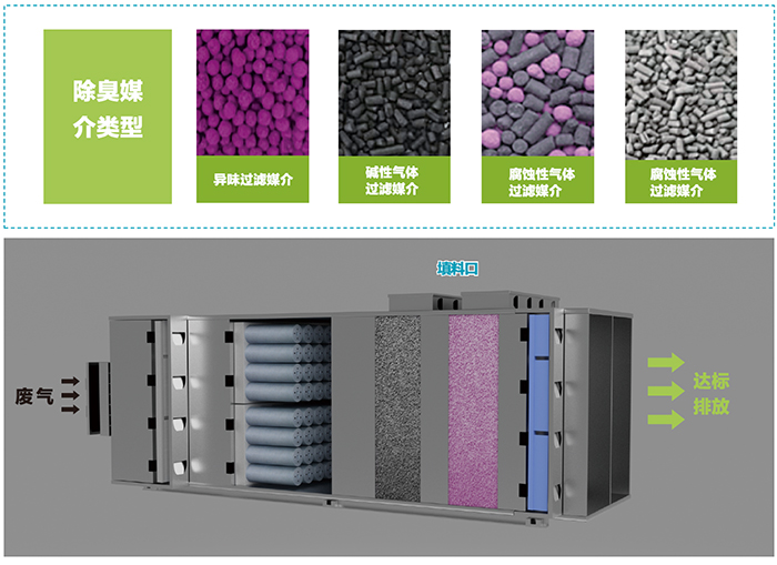 通过化学滤料的物理吸附、化学转化、催化分解三种机理共同作用下将废气分解成无毒、无害、无腐蚀性、无异味的物质的化学变化过程。在多重除臭功能的联合作用下,实现对臭气分子的无害化处理。